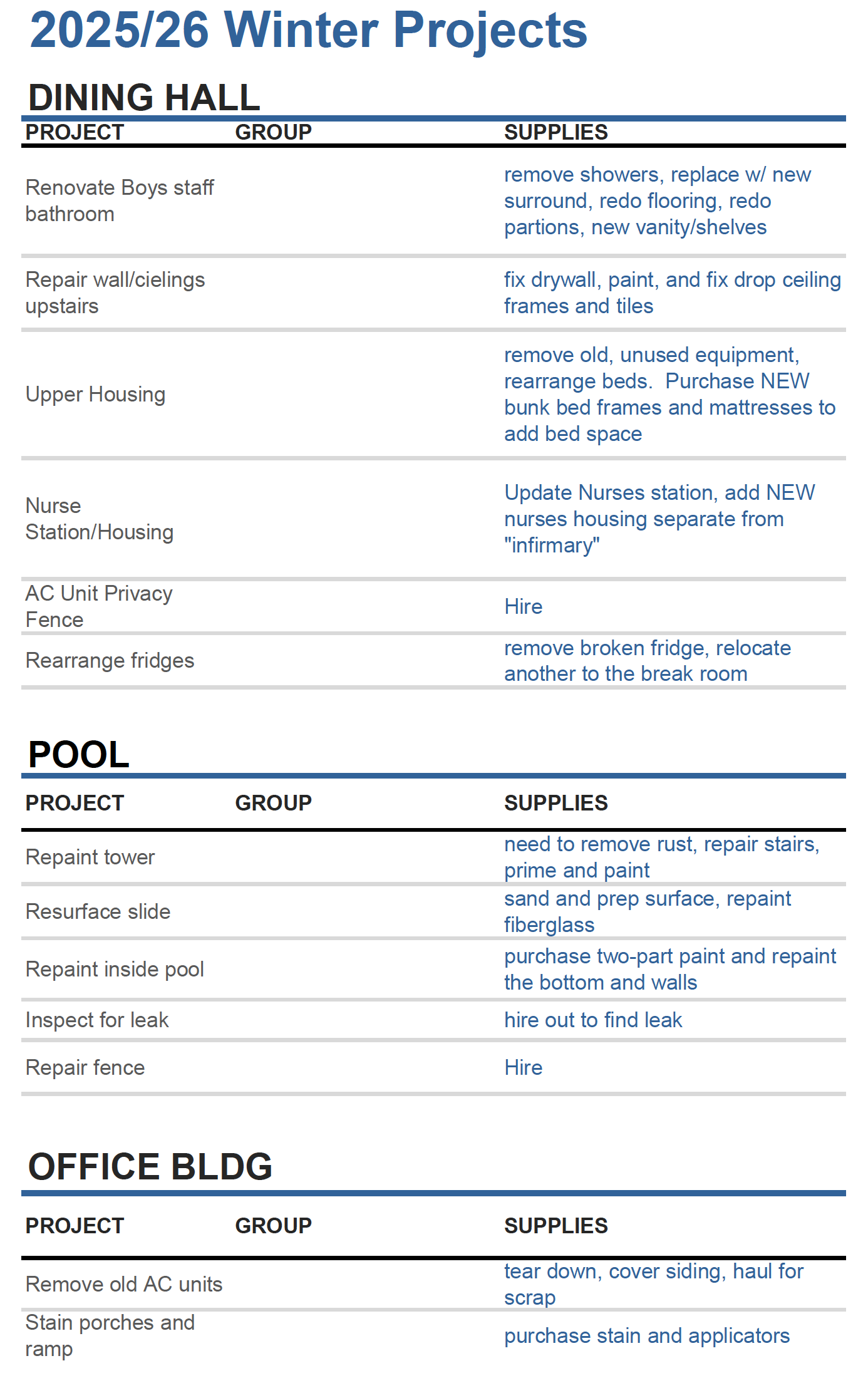 We also schedule community work days in the late Spring to get ready right before Camp begins.
